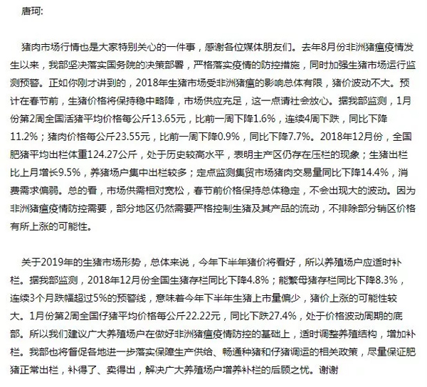 1月16日,在農(nóng)業(yè)農(nóng)村部舉行的2018年主要農(nóng)產(chǎn)品市場(chǎng)運(yùn)行情況發(fā)布會(huì)上,農(nóng)業(yè)農(nóng)村部市場(chǎng)與信息化司司長(zhǎng)唐珂給出前述判斷。