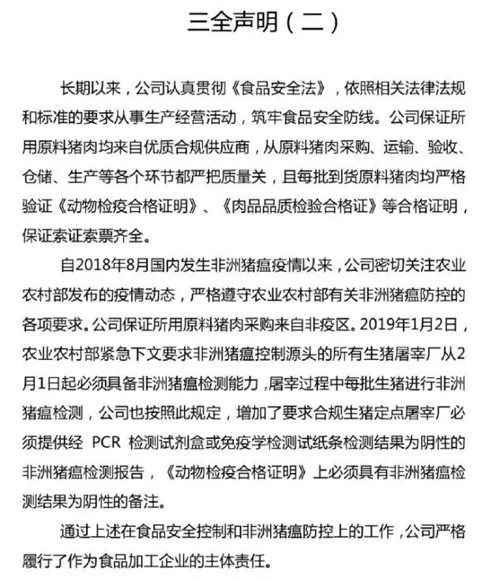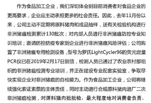 來(lái)源: 冷凍食品網(wǎng) 發(fā)布者:編輯昨天(20日)下午,三全食品通過(guò)新浪微博發(fā)布聲明稱,作為食品加工企業(yè),公司會(huì)主動(dòng)承擔(dān)更多的社會(huì)責(zé)任,主動(dòng)進(jìn)行合規(guī)原料豬肉進(jìn)廠二次非洲豬瘟檢測(cè),將對(duì)原料豬肉“批批檢”,最大程度地對(duì)消費(fèi)者負(fù)責(zé)。