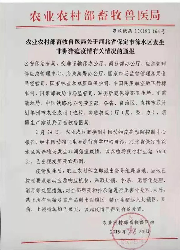 昨日,農業農村部新聞辦公室發布公告,稱河北省保定市徐水區發生非洲豬瘟疫情。